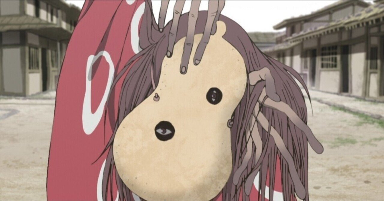 えっとなんだっけ、そうやって犬王の体には最初から「エモーションの写実」が宿っていて、その情動が昇華されることで歪みのない身体を取り戻していく。一方で友魚あるいは友一もしくは友有、彼は最終的に両の脚を砕かれ、両腕も切り落とされ、最後には首を刎ねられてしまう。そのとき画面では、河原の石に友有の怨念みたいのが取り憑いてカサカサと動き出す、それこそ物語の冒頭で出てきた平家蟹みたいに。