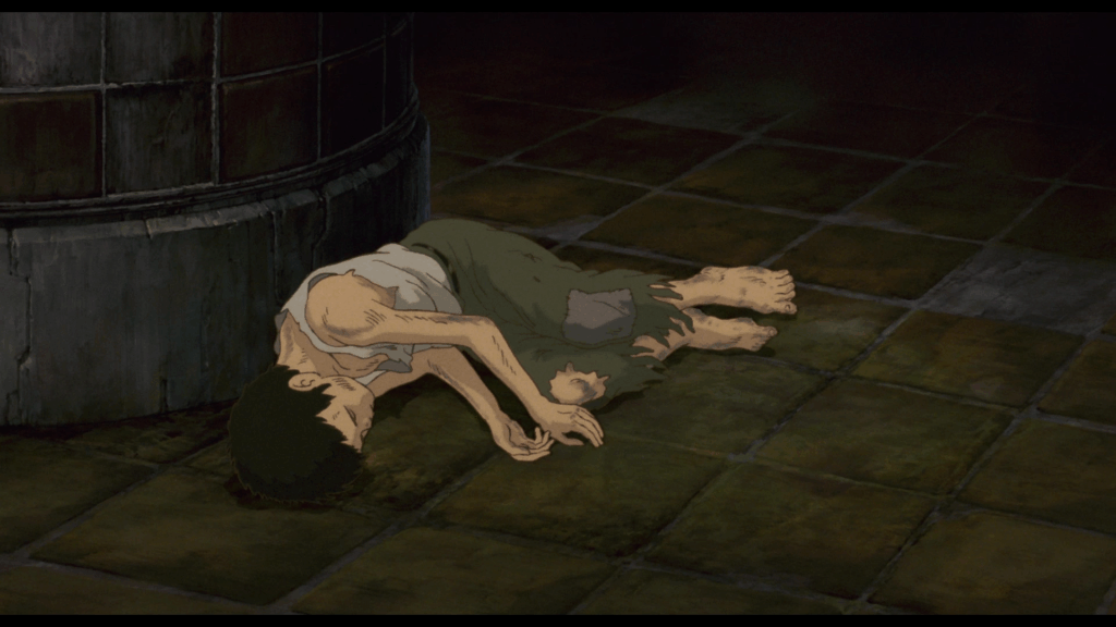 ここに立ち現れているのは穏やかな安らぎとしての死である。再三述べているように、『火垂るの墓』では死を描くに際して何の救いももたらされないわけだが、あえて言えば、死そのものが救いになっている。つまり、生の苦しみから解き放たれる救いとして死が描き出されているのだ。