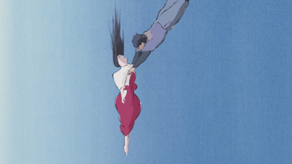 例えば『かぐや姫の物語』(2013)。物語の中盤に、都での鬱屈した生活に嫌気が差していたかぐや姫が、田舎暮らしのときの兄貴分である捨丸(すてまる)と再会するシーンがある。意気投合した2人は駆け落ちをし、空中を自由に飛び回る。しかし、月の住人に逃避行を目撃されて、かぐや姫は海に落下する。その直後のシーンで、夢から目覚めた捨丸の姿が描き出される。彼は夢の余韻に浸りつつも妻と子のもとに戻り、かぐや姫は牛車で都に帰っていく。